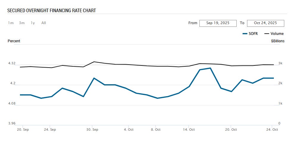 The latest secured overnight financing rate (SOFR) is at the upper bound of the Fed funds rate target range, and SOFR has recently even exceeded this upper bound a couple of times.