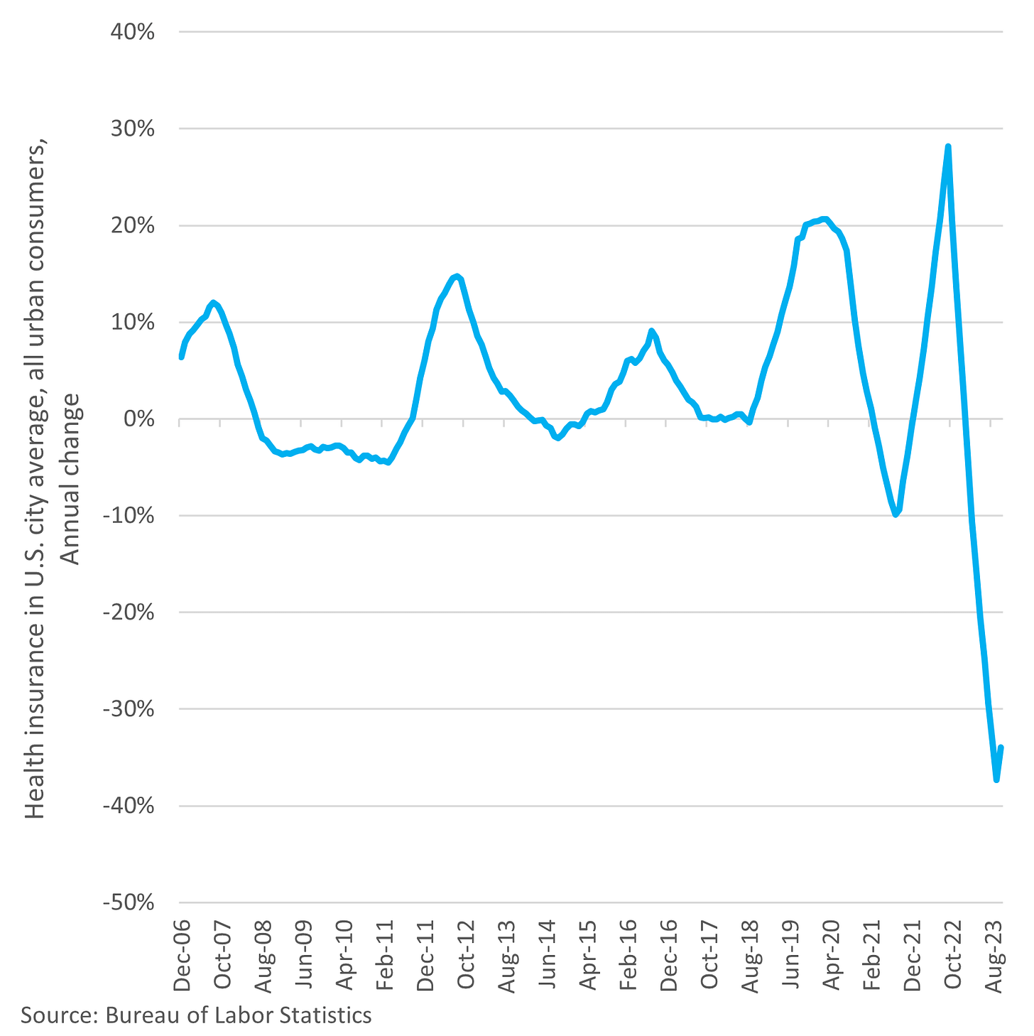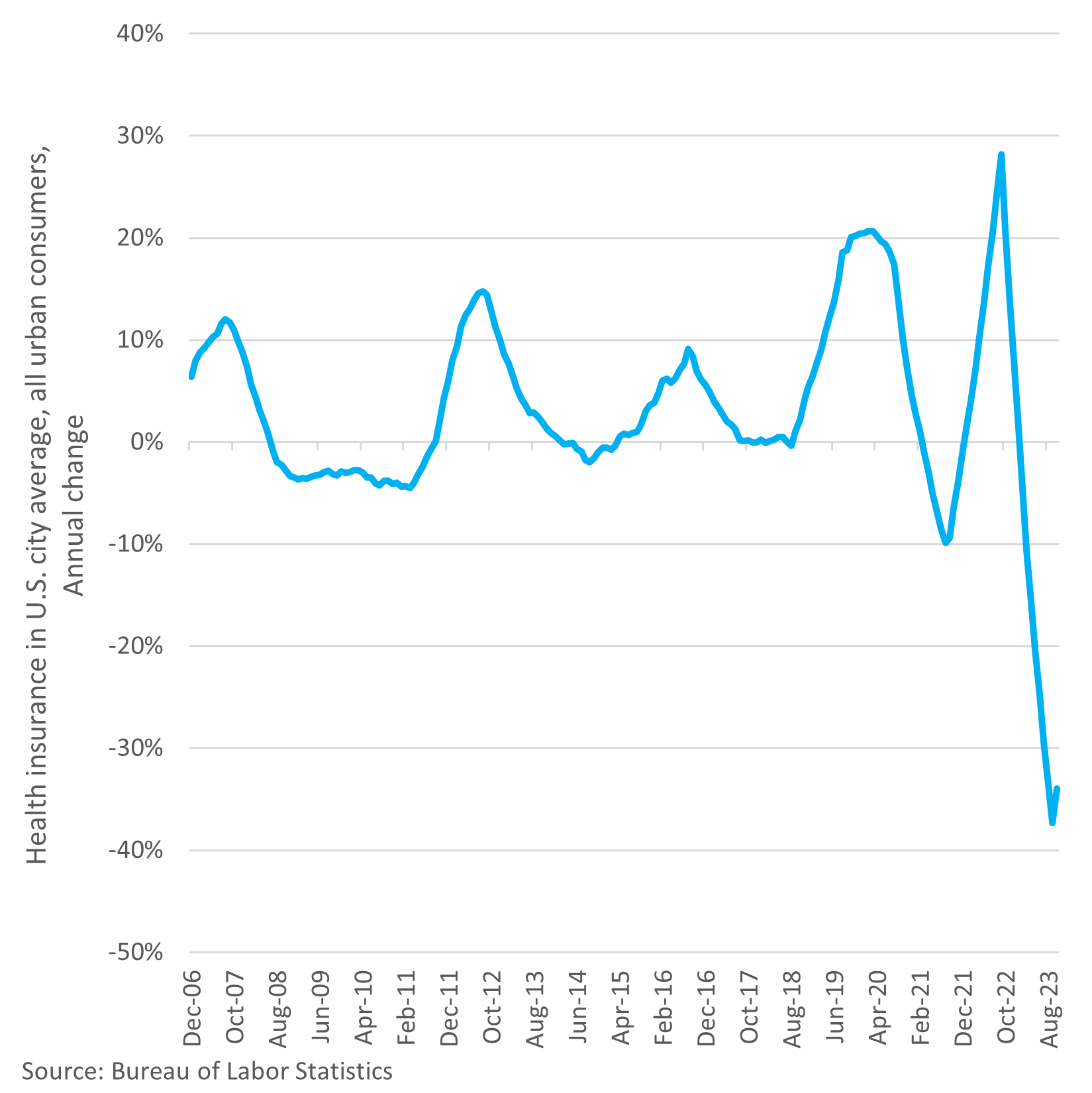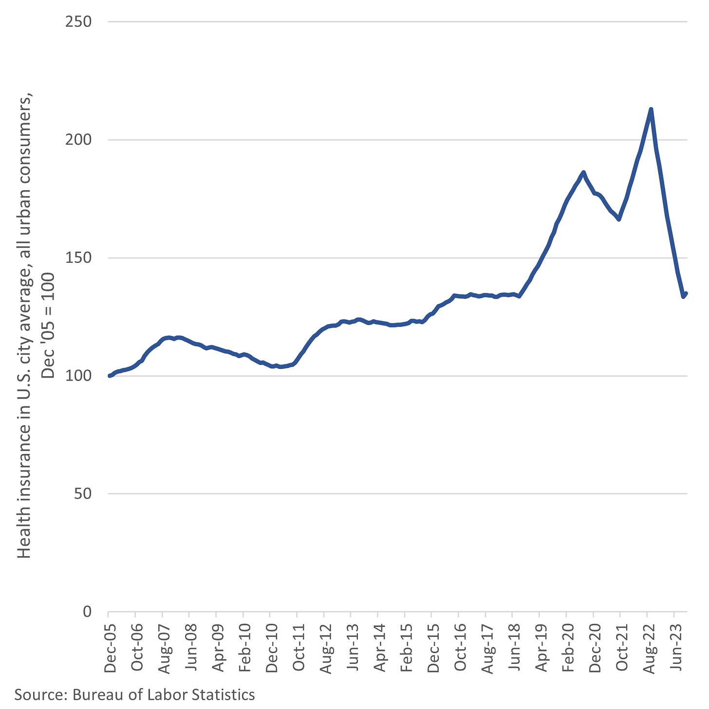 The subindex was set to plunge for 2021 because of a bunch of one-time flukes that were part of the government’s response to the pandemic, and that’s exactly what it did. To be clear, the change was not primarily due to a change in either premiums or the benefits people received, although utilization has fluctuated a lot the last several years. The violent changes in retained earnings were responsible for the equally violent changes in the index. By the fall of 2021, the trend reversed as retained earnings rose, and although this coincided with much higher insurance premiums, the subindex’s increase in 2022 slightly overstated the actual cost to consumers.